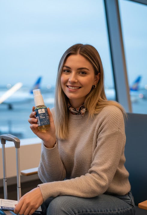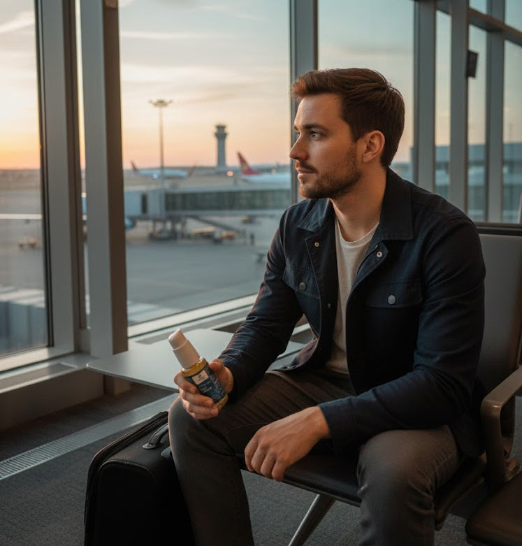 Crowded terminals, turbulence, time pressure, and loss of control can push the body into fight-or-flight. For many travelers, the options have been limited: power through the stress or numb it with whatever is available. Alcohol, sedatives, melatonin, distraction—they don’t calm the nervous system. They just numb it.